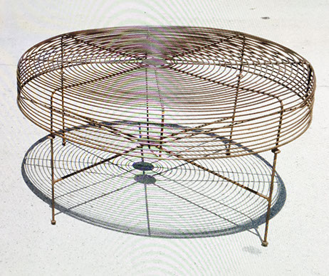 Spikes found near the Los Angeles rail yards were hammered at different depths into the inner rim of the wheel. Melodic bell tones can be heard by tapping the spikes transforming the art piece into a musical instrument.