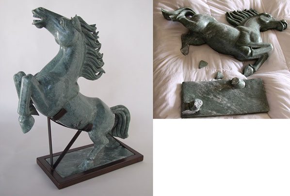 An antique jade horse from Italy was damaged in transit. James bonded the hooves to the base and designed a bronze cradle to support the artwork.