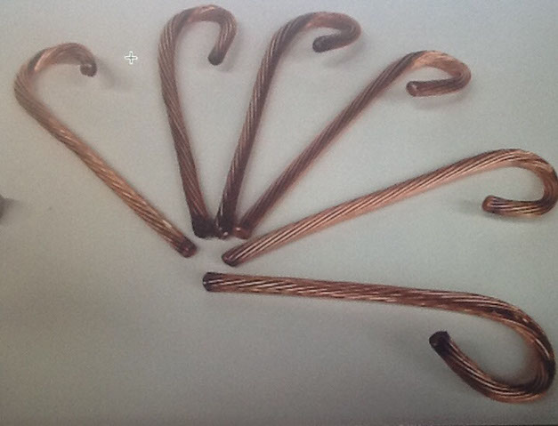 Each Ornament shown is twisted into an original design using copper, aluminum and repurposed wire. The Cross, formed using copper and plaster, is designed as table art.
