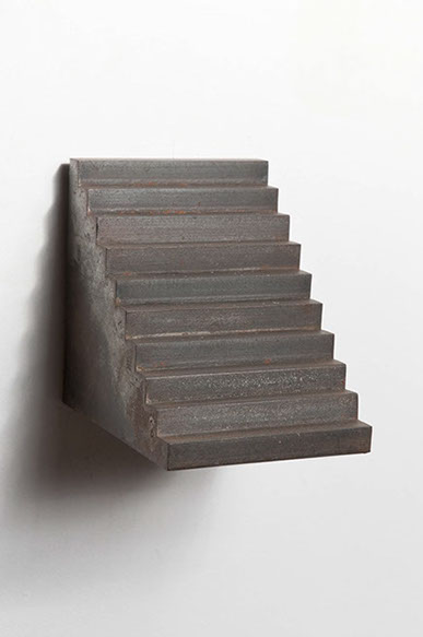 This indoor floor sculpture is composed of plaster and steel.