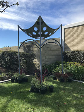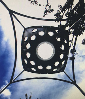 A discarded piece of playground equipment was inverted to form a canopy. It weighs over 200 lbs.The dome is supported by 4 connected seamless stanchions about 10 feet in height.
